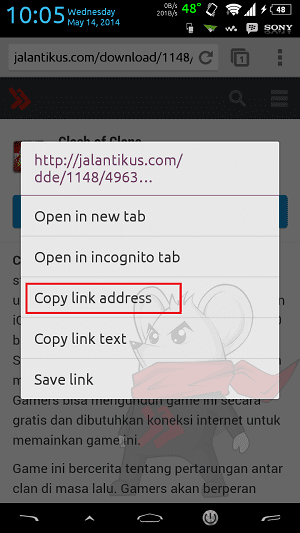 - Untuk mendapatkan link-nya. Buka browser Android kamu, yang Jaka gunakan adalah Chrome. Pilih file yang ingin di download, tahan sebentar link tersebut hingga muncul pop-up. Lalu pilih Copy link address